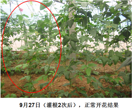 試驗(yàn)結(jié)果:連續(xù)使用2次之后,發(fā)病的豆角開始正常的生長開花結(jié)莢