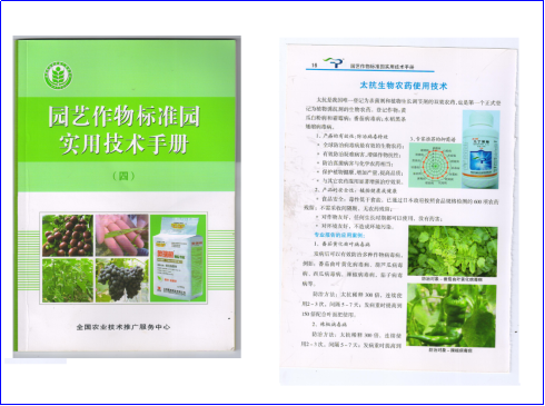 自2012年取得三證后正式推向市場以來,由于安全可靠效果好,太抗生物農(nóng)藥能夠在供給側(cè)為健康生活提供基礎(chǔ),奠立了太抗在生物農(nóng)藥行業(yè)領(lǐng)軍前行的良好格局。由于產(chǎn)品推廣示范應(yīng)用的良好效果,太抗生物農(nóng)藥入選農(nóng)業(yè)部關(guān)于印發(fā)《農(nóng)企合作共建示范基地深入推進<到2020年農(nóng)藥用量零增長行動實施方案計劃>實施方案》(農(nóng)農(nóng)【2015】61號),被全國農(nóng)業(yè)技術(shù)推廣服務(wù)中心編入《園藝作物標準園使用技術(shù)手冊》,也被成都市植物檢疫站編入《成都市生物農(nóng)藥應(yīng)用手冊》中第一個推薦使用的生物農(nóng)藥。